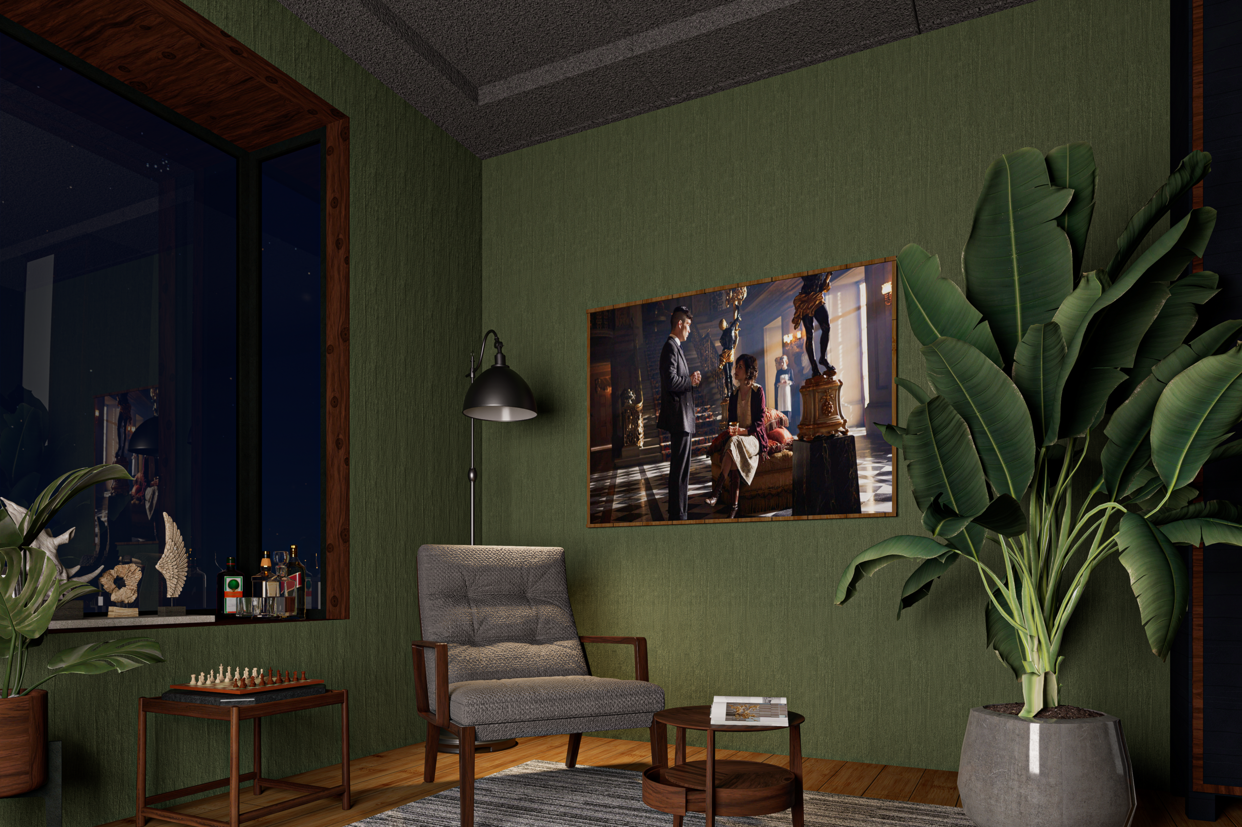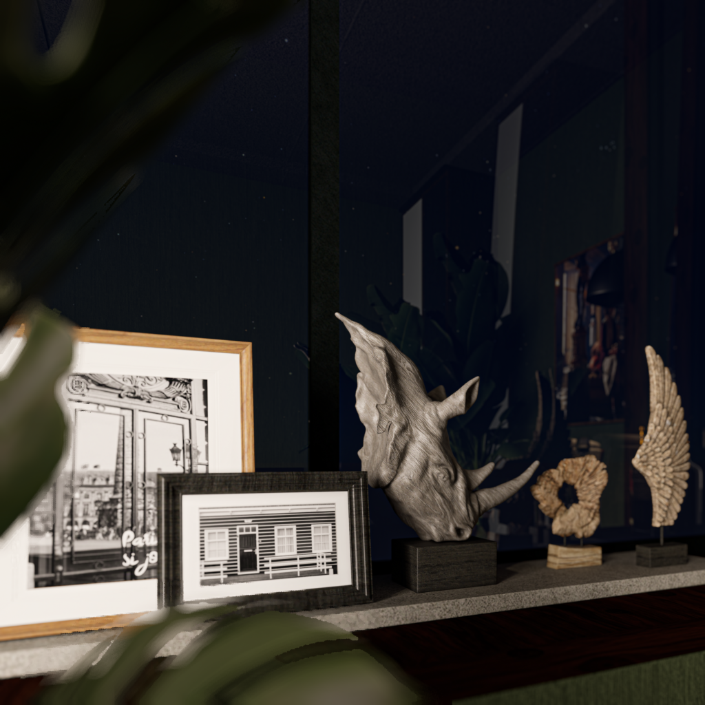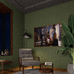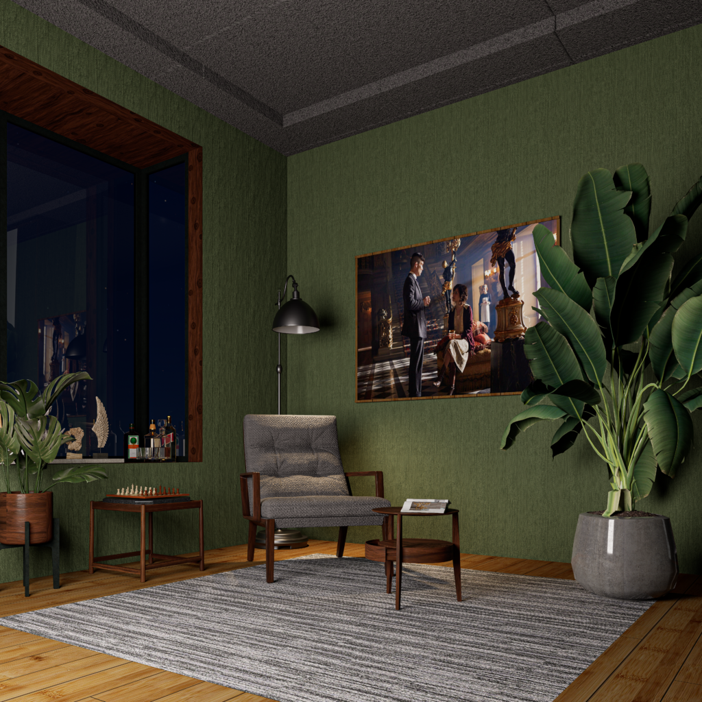 Verdant Retreat explores the idea of a peaceful indoor sanctuary. The design focuses on deep green textured walls, warm wooden finishes, and carefully selected decorative elements that create a relaxing environment. Indoor plants and soft ambient lighting reinforce the connection between interior space and nature.