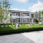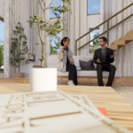 This interior design concept showcases a spacious double volume living room filled with natural light and styled with a soft, modern aesthetic. Clean white surfaces, warm wooden accents, and lush indoor plants create a fresh and calming atmosphere. The open layout features a comfortable lounge area, a sleek dining space, and a visually connected upper level with glass railings. Thoughtfully placed decor, track lighting, and a large landscape artwork add personality while maintaining a refined minimalist feel. This design highlights balance, openness, and contemporary comfort ideal for modern family living.