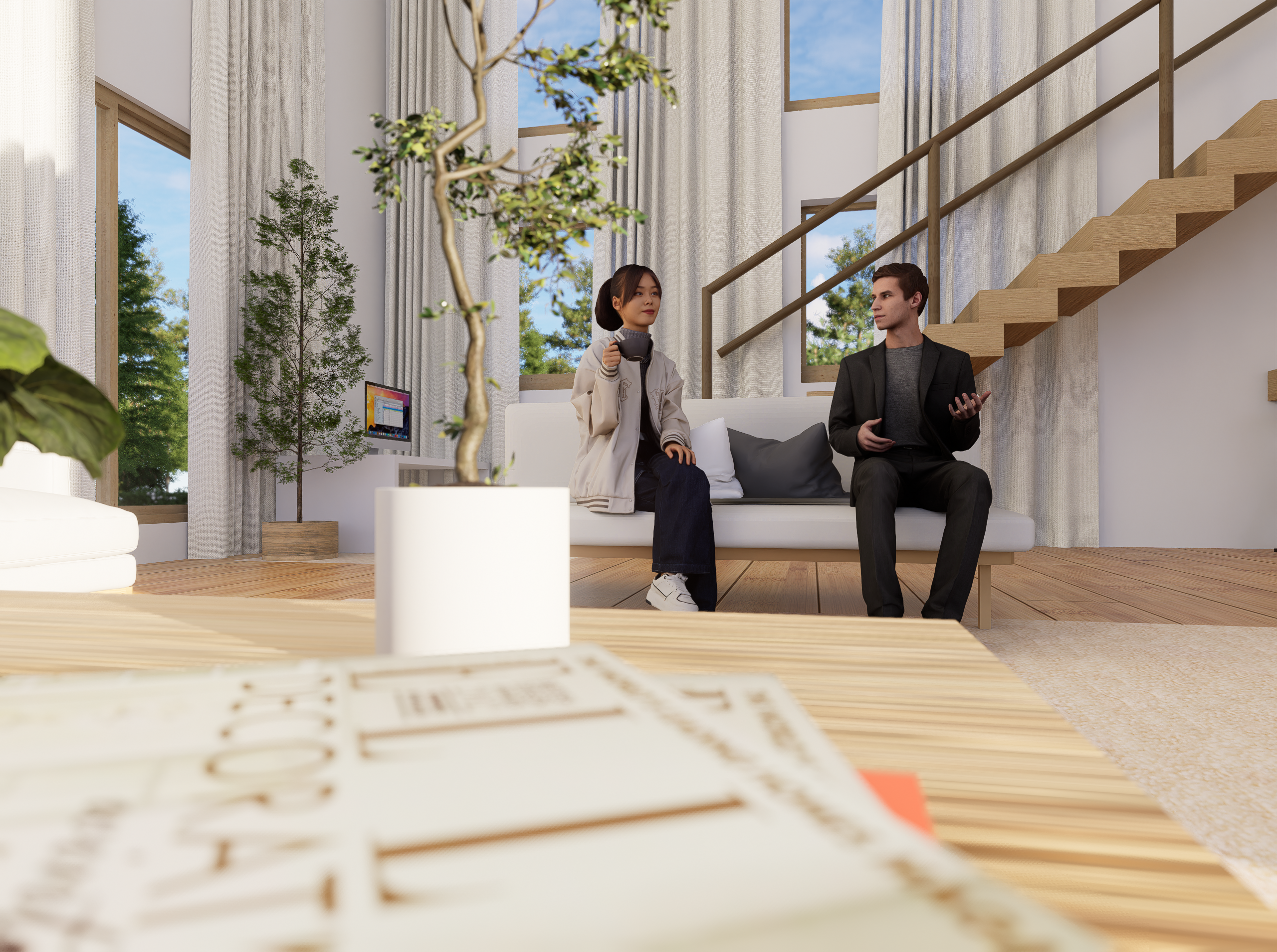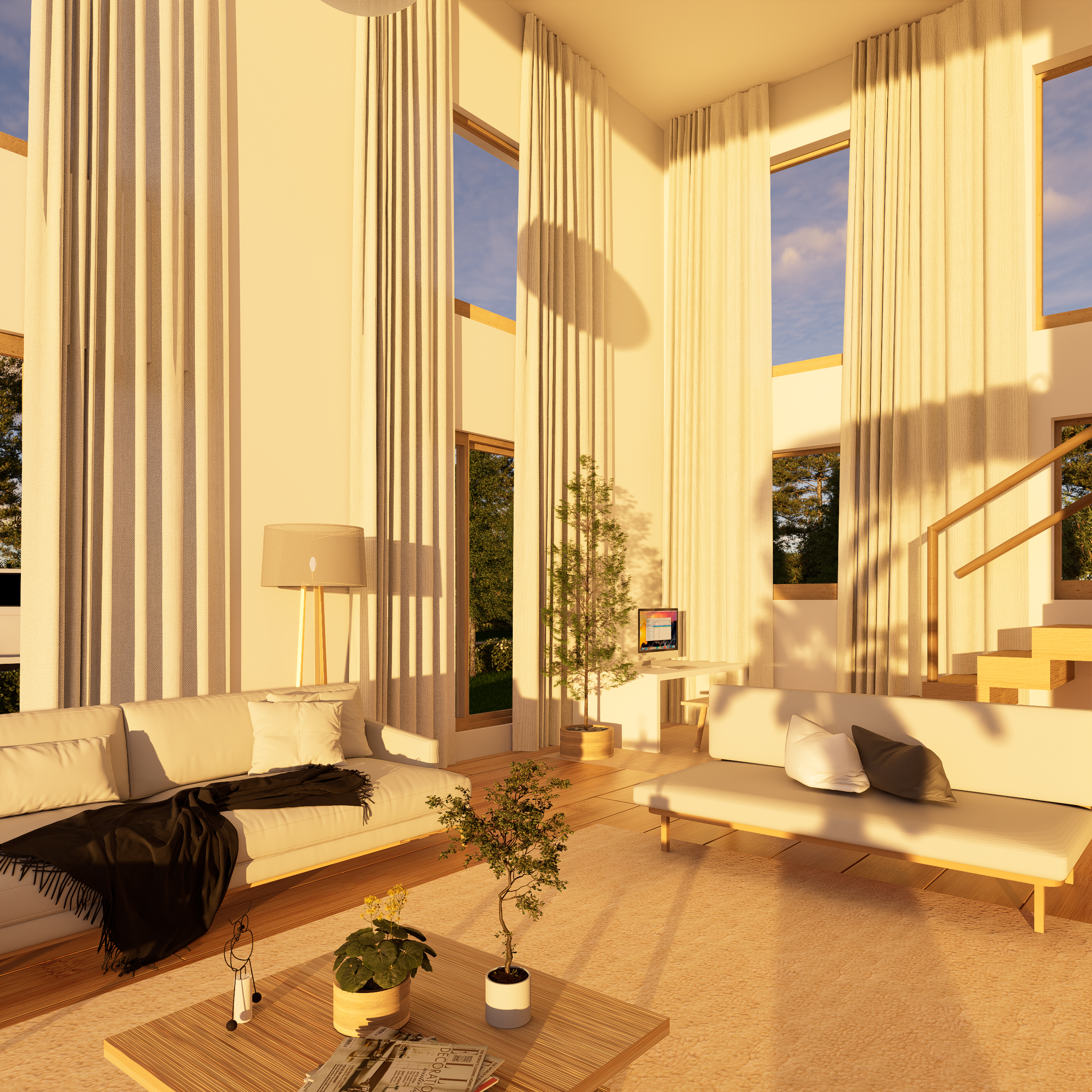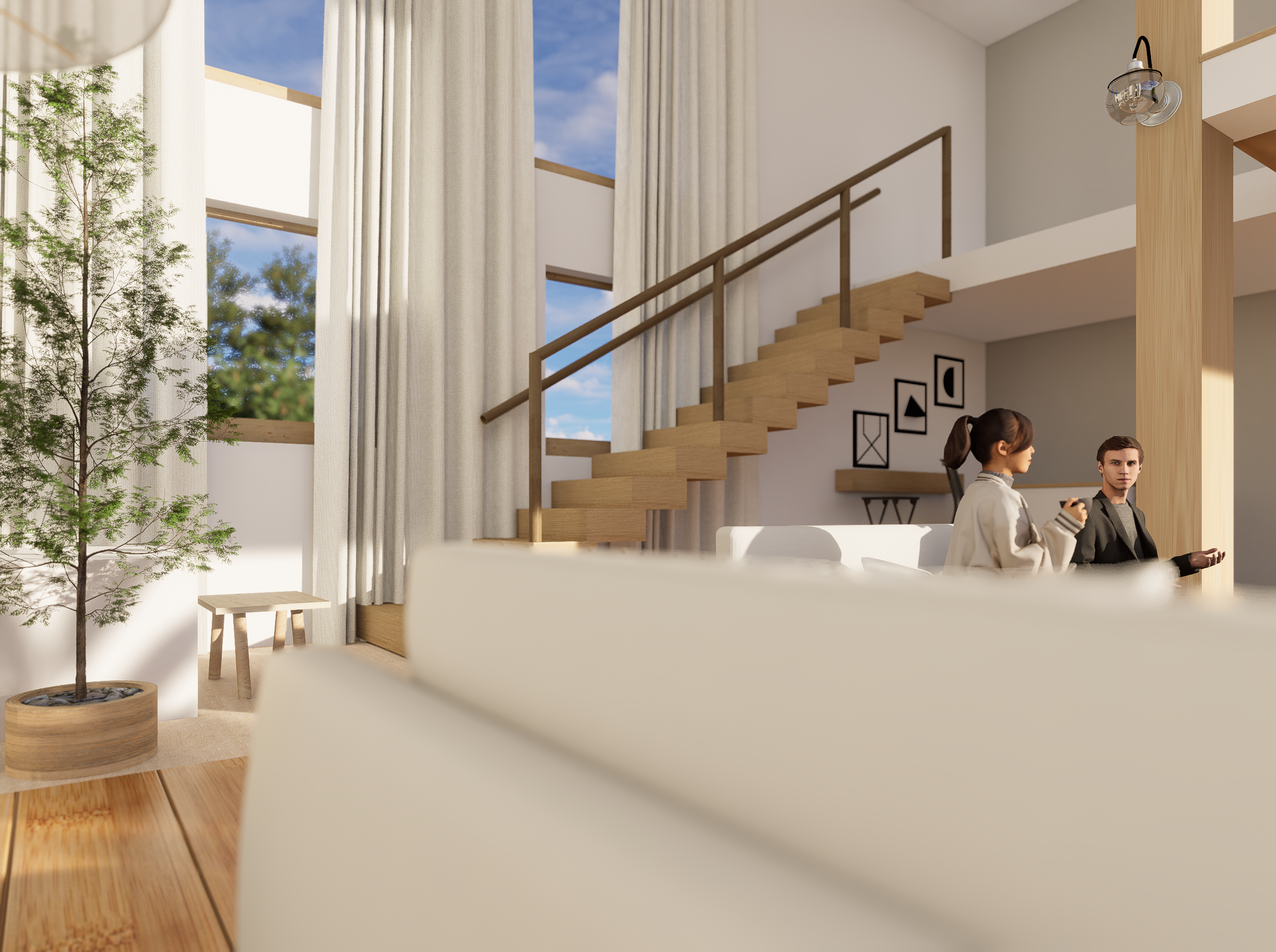 This interior scene captures a calm and inviting living area styled with soft daylight, warm wooden textures, and tall windows that frame the surrounding greenery. Two people are seated on a minimalist sofa, engaged in a relaxed conversation, adding a sense of life and scale to the space. The composition highlights key design elements clean lines, neutral tones, indoor plants, and a floating wooden staircase that enhances the open, airy feel. The blurred foreground table surface adds depth to the image, giving the render a natural, photographic realism. This design expresses comfort, simplicity, and modern living at its best.