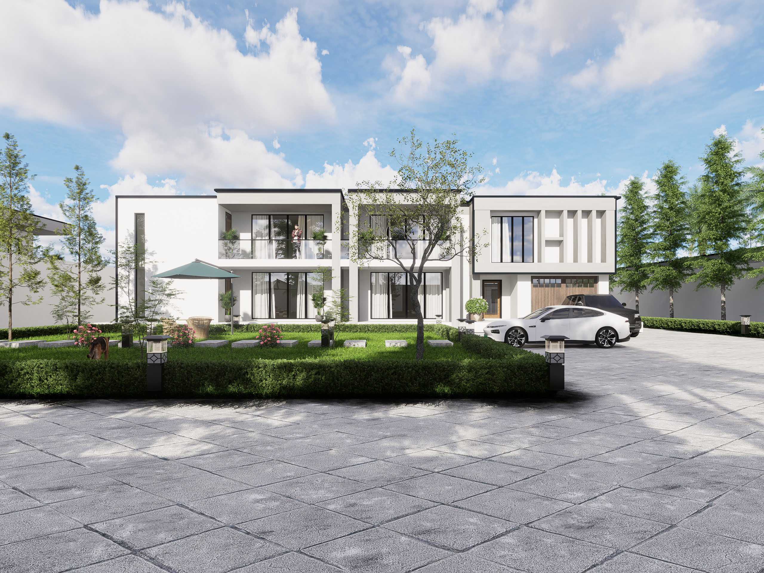 This residence embodies a refined modern architectural style defined by clean lines, symmetry, and a strong connection between indoor and outdoor living. The façade features a minimalist color palette of whites and grays, accentuated by large glass panels that invite natural light while providing expansive views of the garden. Subtle geometric forms and vertical design elements add rhythm and depth to the structure, creating a timeless visual appeal.