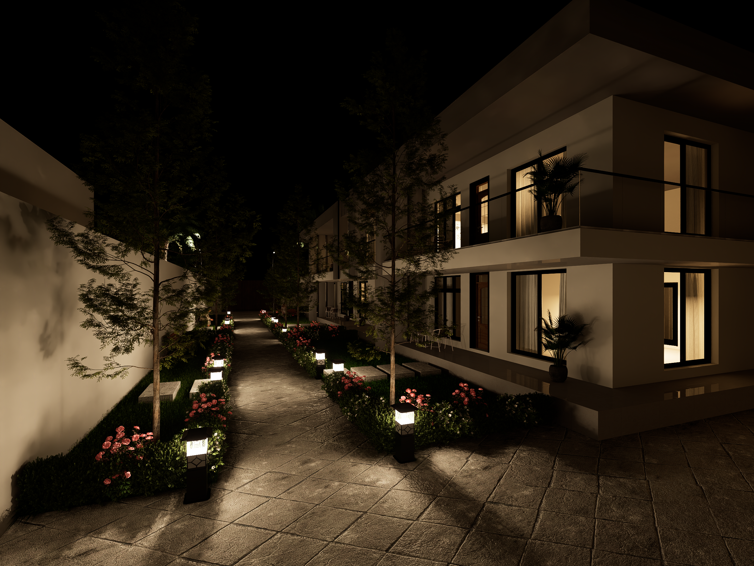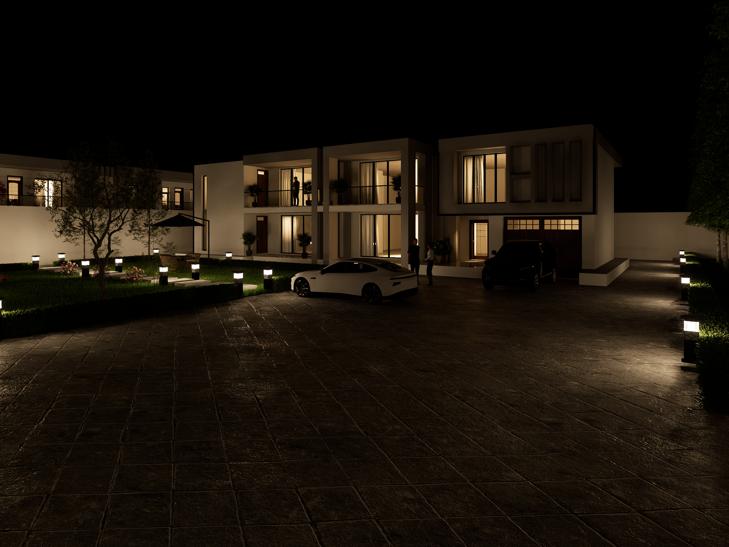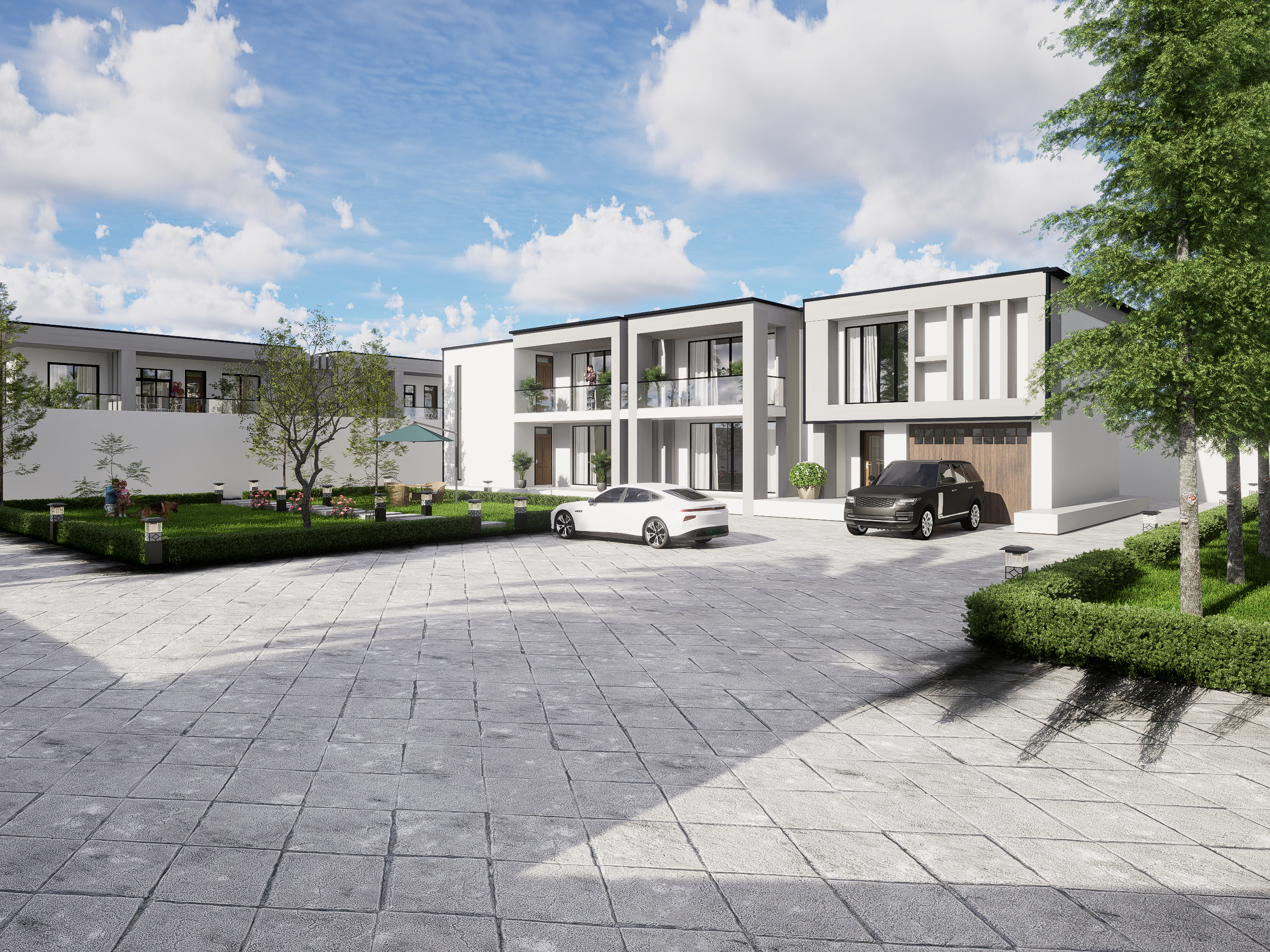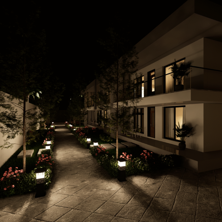 The landscape complements the architecture perfectly a lush green lawn, soft hedges, and carefully placed trees provide serenity and balance. The open garden space is designed not just for aesthetics but for experience a place where family moments, relaxation, and nature coexist harmoniously.