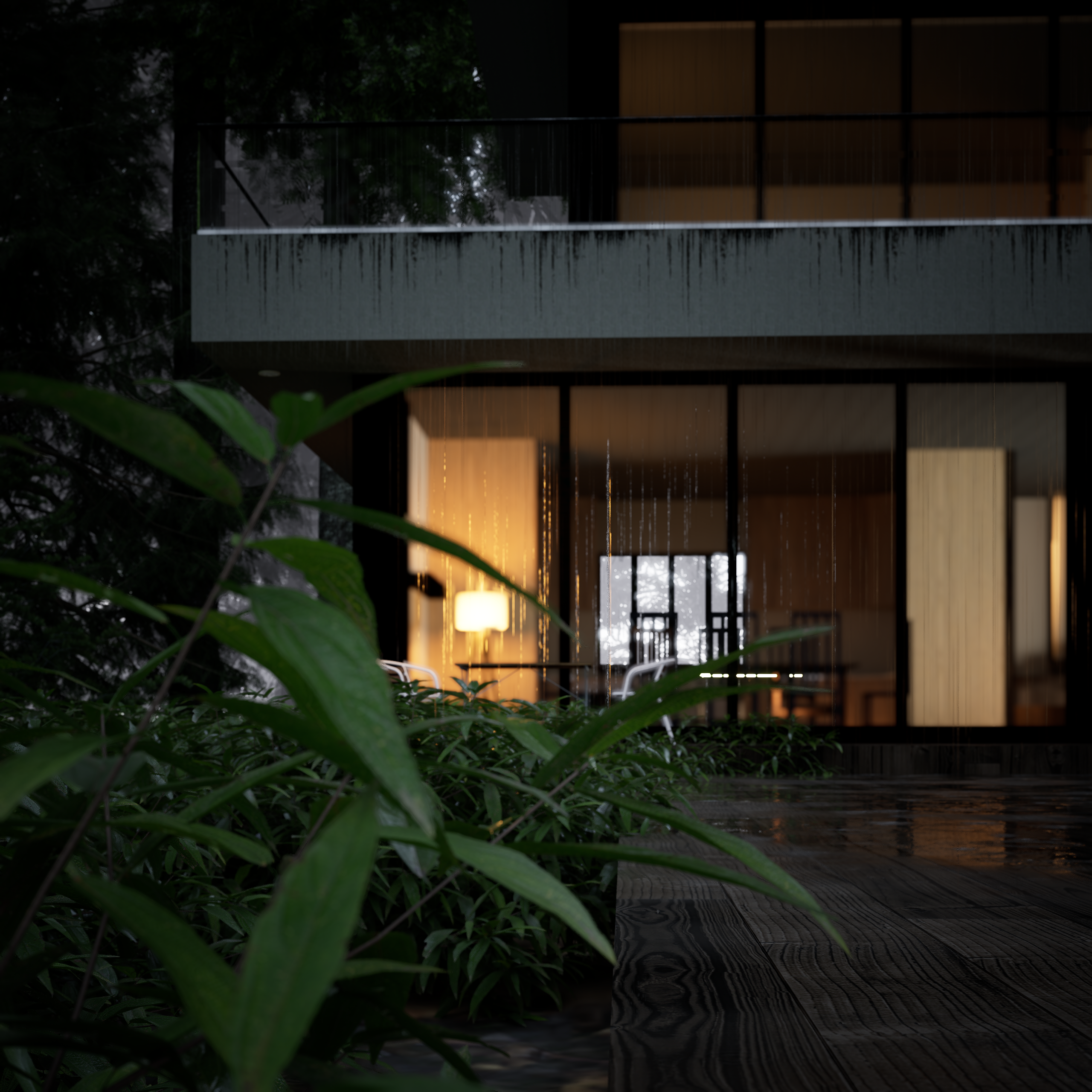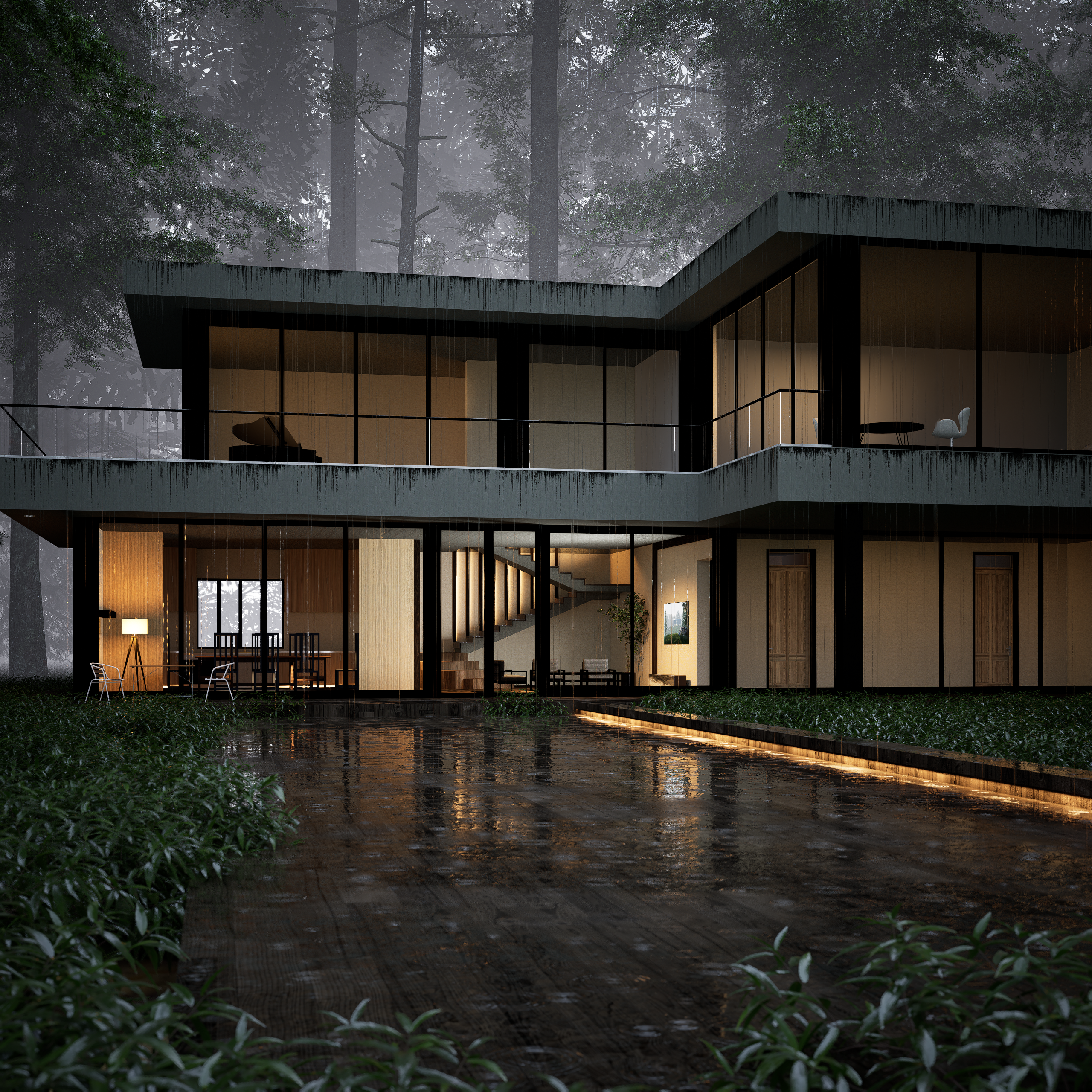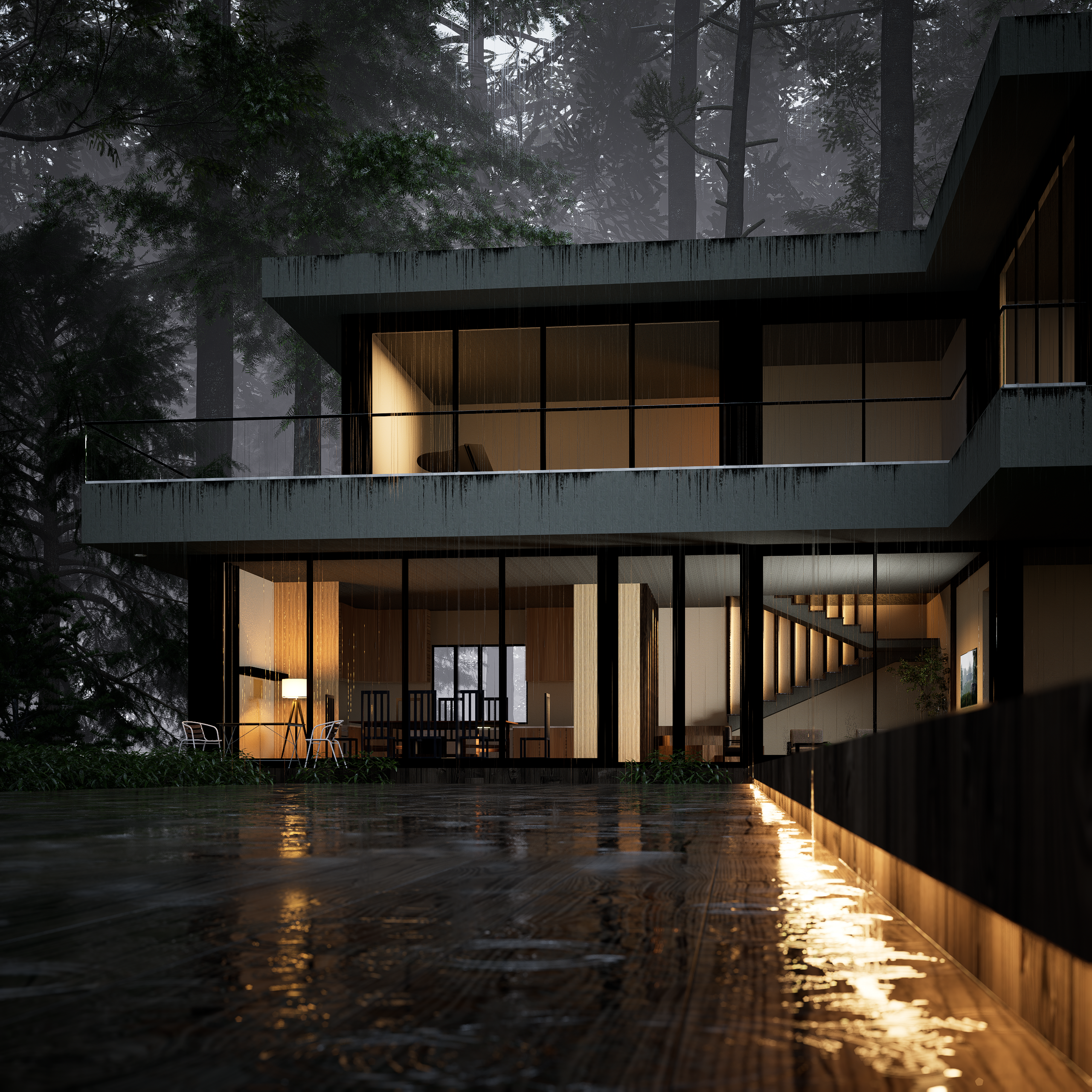 The Mistwood Retreat is a modern elevated residence designed to embrace tranquility and isolation within a natural forest setting. The structure rests elegantly on slender columns, lifting the living spaces above the lush greenery and allowing nature to flow freely beneath. With wide glass façades, the house opens fully to the surrounding mist and trees, creating a seamless connection between interior warmth and the calm of the outdoors.